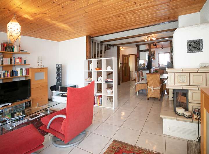 Eine großes, bodentiefes Fenster mit Blick in den Garten und die dazu gehörige Zugangstür, ebenfalls aus Glas, sorgen für eine angenehme Helligkeit im Wohnraum. Für eine wohlige Wärme in den kalten Monaten kann man den Kaminofen mit Heizkassette befeuern. Eine Garderobe und ein Gäste-WC sind ebenfalls im Erdgeschoss vorhanden.