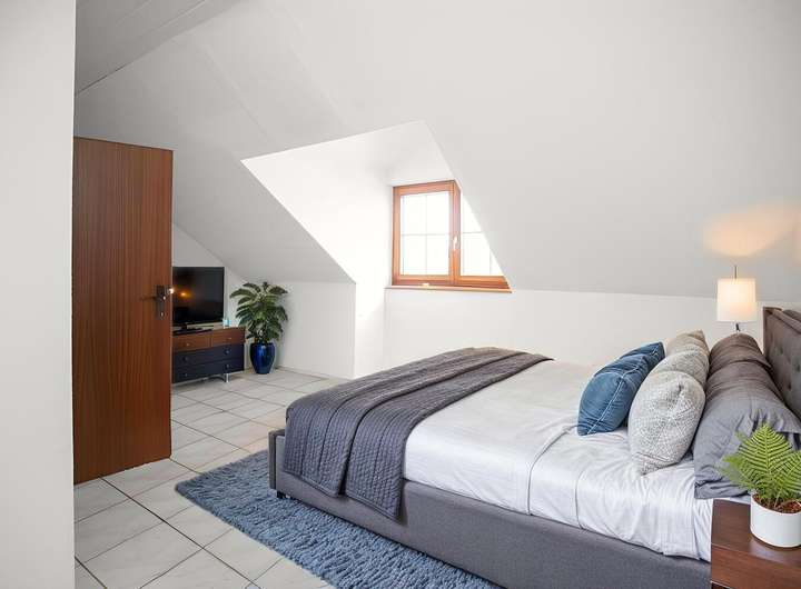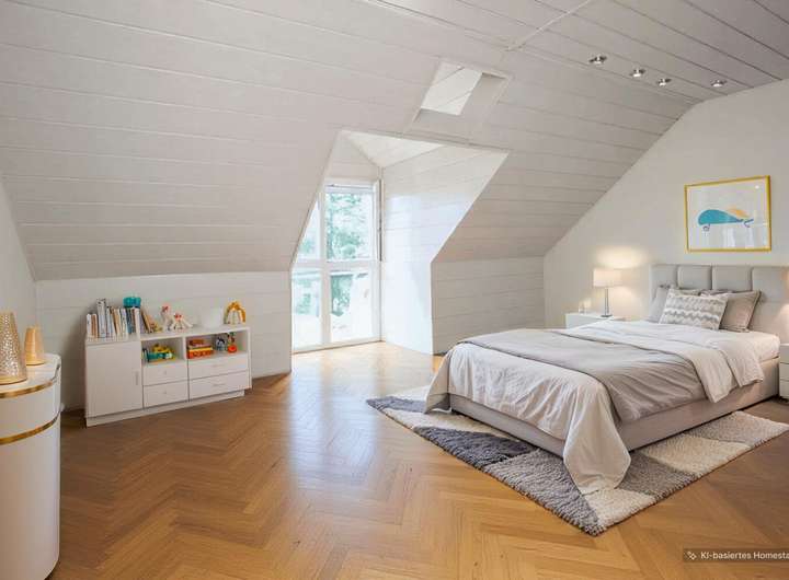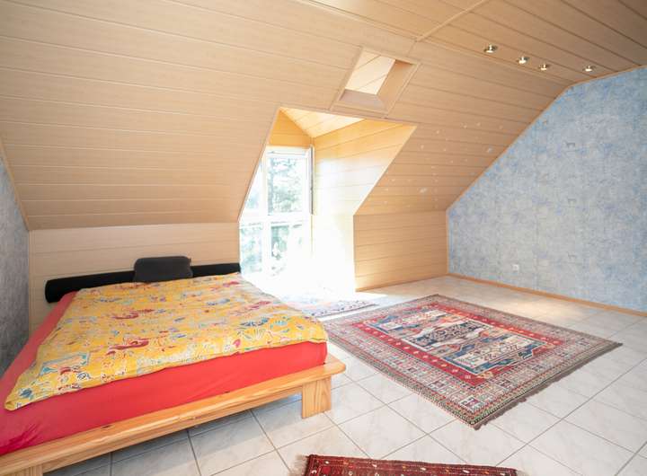 Das Obergeschoss beherbergt zwei Schlaf-/Zimmer und ein Tageslichtbad mit Badewanne und Dusche. Zwei weitere Schlaf-/Zimmer befinden sich im ausgebauten Dachgeschoss. Zwei Gauben mit großen Fenstern im Dachgeschoss vergrößern nicht nur den Wohnraum, sondern sorgen auch für viel Tageslicht.