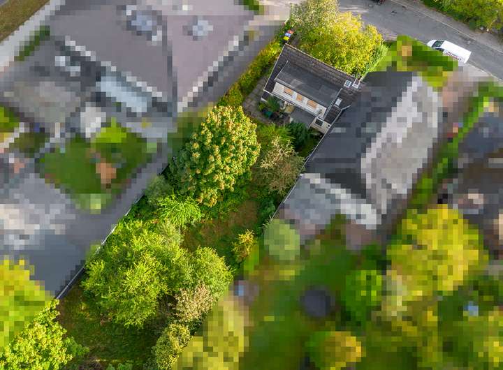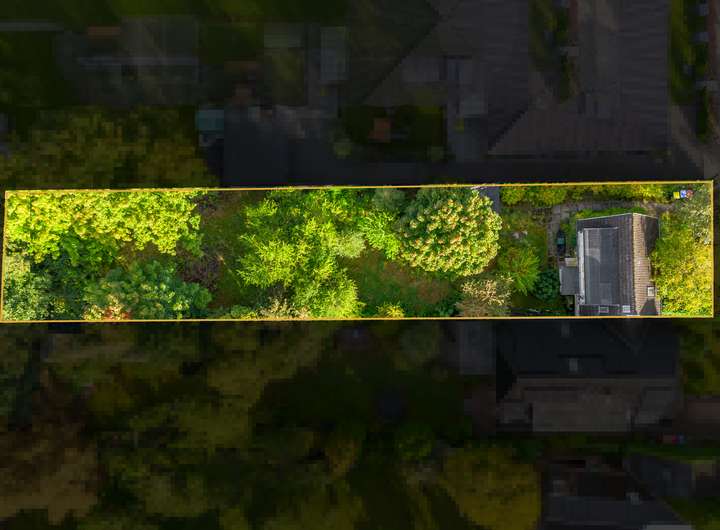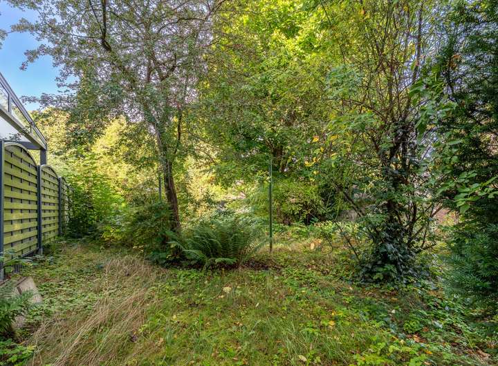 Die großzügige Form des Grundstücks erlaubt vielfältige Nutzungskonzepte. Neben der Erhaltung oder Erneuerung der Doppelhaushälfte könnte – vorbehaltlich behördlicher Genehmigungen – auch ein einseitig angebautes Einfamilienhaus mit rund 165 m² Grundfläche realisiert werden (Angabe ohne Gewähr). Das Baufenster beträgt im Falle eines Anbaus an den Nachbarn ca. 15 m x 11 m. Dies entspricht bei einer 1,5-geschossigen Bauweise rund 275 m² BGF und damit ca. 210 m² Wohnfläche.