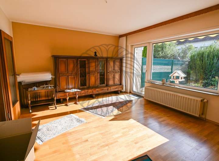 Im Erdgeschoss empfängt Sie ein funktionaler Grundriss: Neben einem Gäste-WC und der Küche liegt das helle Wohn- und Esszimmer. Eine charmante Durchreiche verbindet Küche und Essbereich – ein Detail aus der Bauzeit, das den Charakter des Hauses unterstreicht. Vom Wohnzimmer aus öffnet sich der Zugang zur Terrasse und zum Garten. Der Außenbereich ist pflegeleicht mit Rasen angelegt und bietet Raum für Entspannung, Spielen oder gesellige Stunden im Freien.