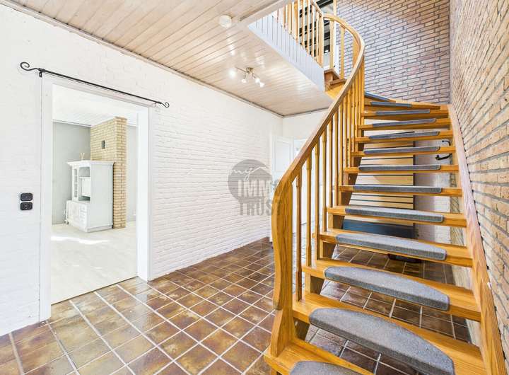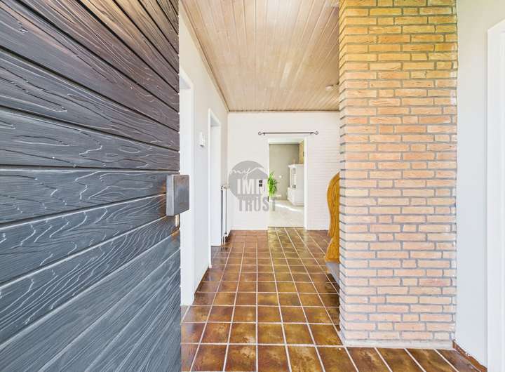 Im Inneren empfängt das Haus mit einer durchdachten Raumaufteilung und fließenden Übergängen. Lichtdurchflutete Räume schaffen eine einladende Wohnatmosphäre mit viel Offenheit und Wärme. Herzstück ist das rund 50 m² große Wohn- und Esszimmer mit breiter Fensterfront, Terrassenzugang und gemauertem Kamin mit Eichenholzverkleidung – ideal für wohlige Abende. Sichtklinkerwände setzen dabei unverwechselbare Akzente und verleihen dem Interieur einen authentischen, stilvollen Charakter.