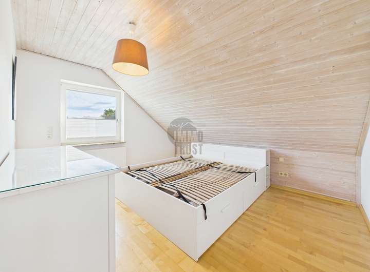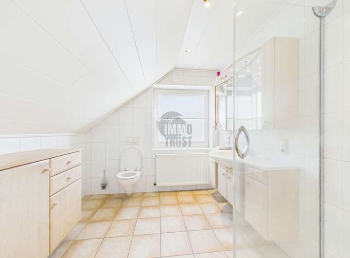 Im Dachgeschoss begeistert der großzügige Schnitt mit bodentiefen Fenstern und offenem Dachstuhl – ein Ort mit besonderem Flair und viel Licht. Das Badezimmer ist hell gestaltet, gepflegt und funktional ausgestattet.. Außenrollläden sorgen in den Schlafräumen für Ruhe und optimale Verdunkelung.