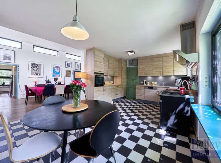 The house has an open-living concept with for example high ceilings (3.50 meters) in the living rooms. Large usage of glass in the upper areas floods the living rooms with light. The windows are floor-to-ceiling and reinforce the impression of spaciousness.