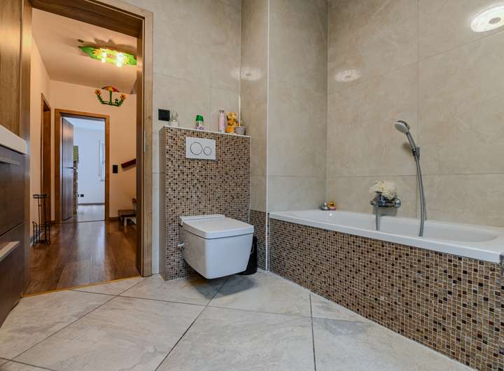 In der ersten Etage befinden sich drei gut geschnittene Schlafzimmer sowie ein modernes Badezimmer mit Dusche, Badewanne und Fenster. Zwei der Schlafzimmer bieten direkten Zugang zu einem Balkon – perfekt, um den Tag mit frischer Luft zu beginnen.