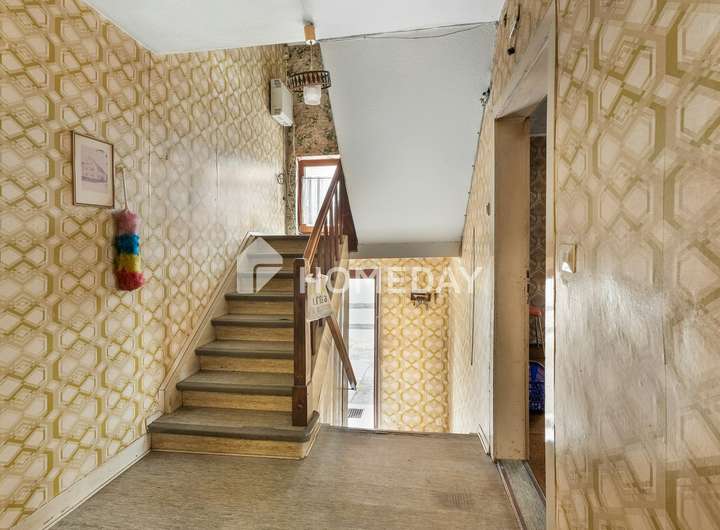 Das Haus verfügt über ein Tageslichtbad sowie eine einfache Ausstattung, die dem Baujahr entsprechend erhalten geblieben ist. Die Raumaufteilung bietet eine klassische Struktur mit großzügigem Wohnbereich, Schlafzimmern im Ober- und Dachgeschoss sowie Küche und Esszimmer im Erdgeschoss.