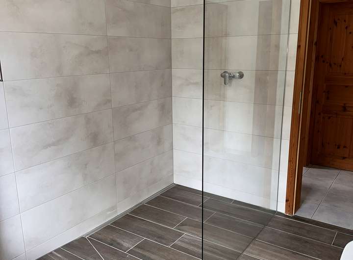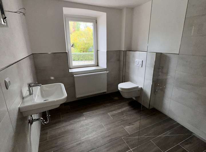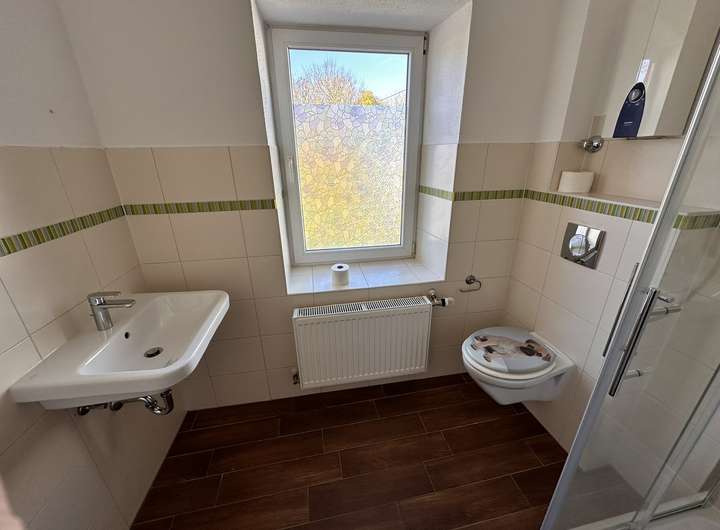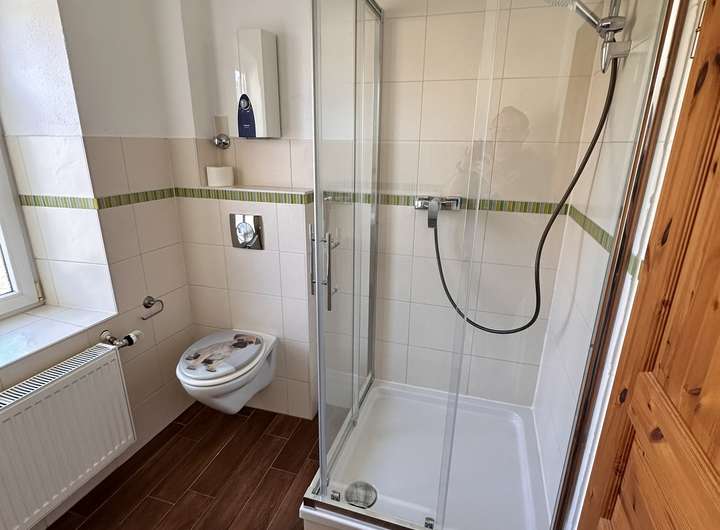 Im Erdgeschoss befindet sich rechts vom Eingang ein neu gestaltetes Badezimmer (Fertigstellung Ende 2025) mit ebenerdiger, rollstuhlgerechter Dusche.