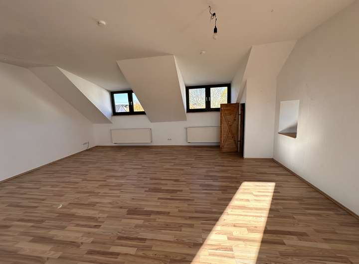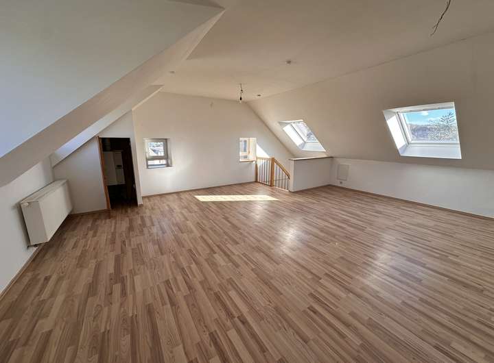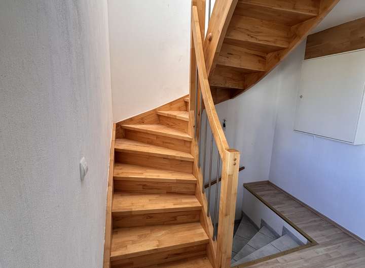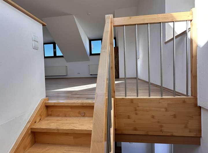 Eine handgefertigte Holztreppe vom Schreiner führt weiter ins ausgebaute Dachstudio, das mit seiner großzügigen Fläche viele Nutzungsmöglichkeiten bietet – ob als Schlafzimmer, Atelier oder Wohnbereich.