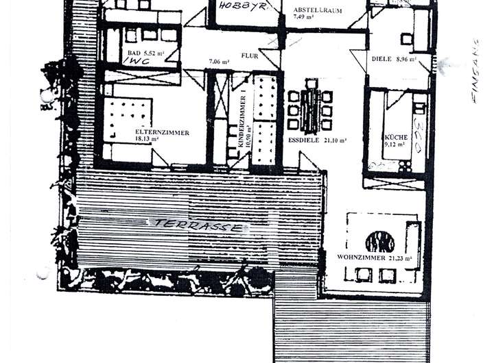 Das Haus hat 4 ½- Zimmer, aufgeteilt auf Diele, WC, Küche, Essdiele, Wohnzimmer, Flur, Kinderzimmer I, Elternzimmer, Bad, Kinderzimmer II, dazu Abstellraum kl., Abstellraum gr., Hobbyraum, 2 ineinander übergehende Terrassen, Abstellraum