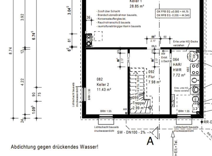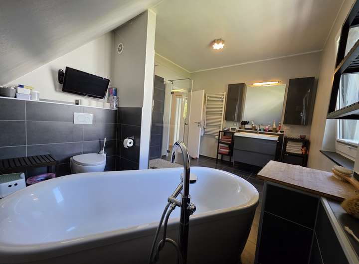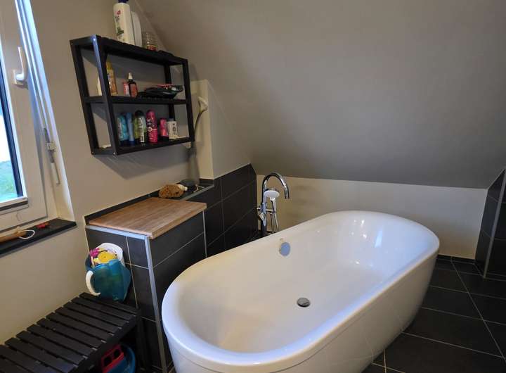 Das Haus hat einen Keller mit großem Kino- und BarKeller, ein großes Bad im OG mit Wäscheschacht direkt in den HWR im Keller und einen großen offenen Wohn- und Essraum im EG.