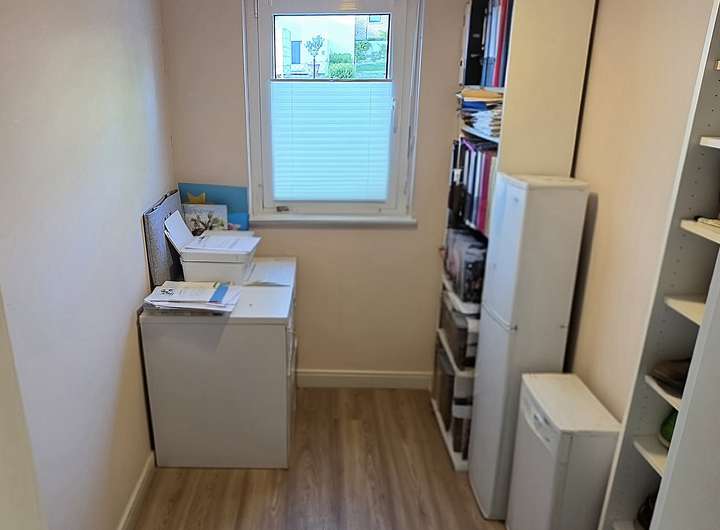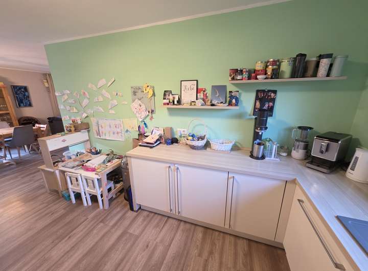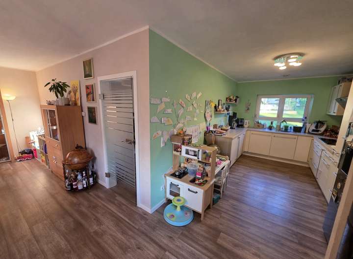 Das EG verfügt außerdem über ein Gästebad, einen Büroraum und eine zum Wohnbereich große offene Einbauküche mit modernen Geräten.