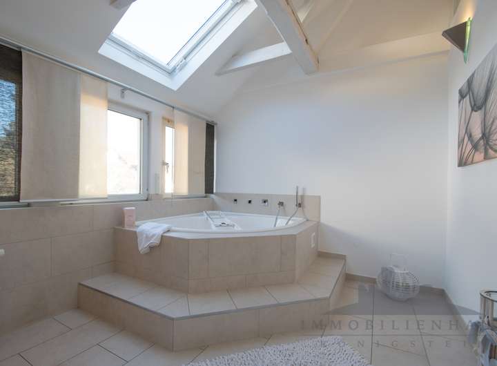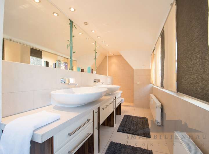 - Badezimmer mit großer Eckbadewanne, 2 Waschbecken, ebenerdiger Dusche, WC