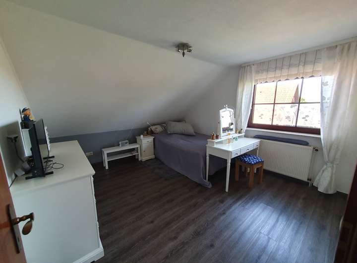 Im zum Garten gerichteten Zimmer mit Dachfenster geht eine Holzwangentreppe aus Kiefer ins Dachgeschoss. Dort befindet sich ein weiterer ausgebauter Raum mit Dachfenster und Rollladen sowie ein als Abstellraum genutzter großer Dachbodenbereich.