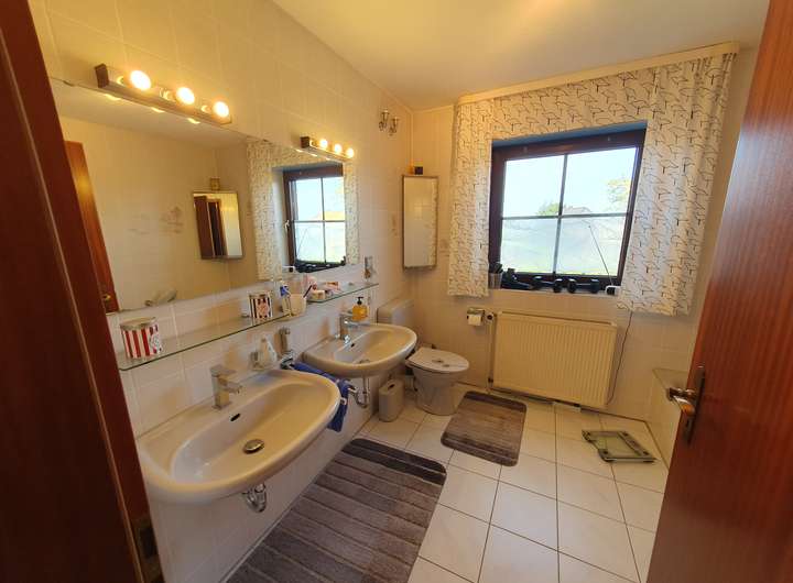 Im Obergeschoss befinden sich ein Elternschlafzimmer und ein großes Badezimmer mit Badewanne, Dusche und zwei Waschbecken sowie zwei weitere z. B. als Kinderzimmer