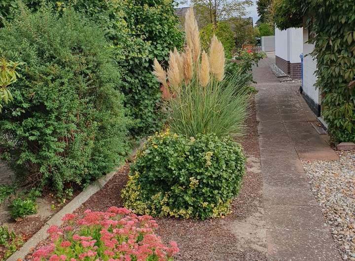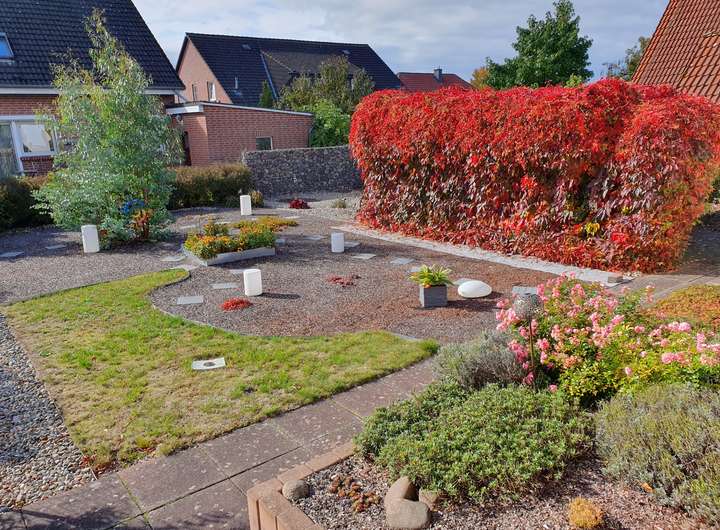 Der großzügige Garten ist derzeit pflegeleicht gestaltet, er bietet Platz für die eigenen Gartenträume. Die Gartengröße verteilt sich zu etwa 1/3 auf den Vorgarten Richtung Straße und etwa 2/3 auf den Garten hinter dem Haus Richtung Süden. Bei allen Häusern in der