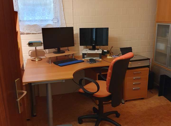Im Kellergeschoss gelangt man vom großzügigen Flur ( viel Stauraumplatz) zum Hauswirtschaftsraum mit benachbartem Versorgungsraum (Wasseranschluss, Stromkasten, Telekommunikation). Außerdem befindet sich im Keller der Heizungsraum, ein großer Vorratsraum und zwei weitere Räume, z.Zt. als Gästezimmer bzw. Büro genutzt.