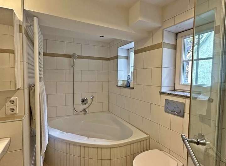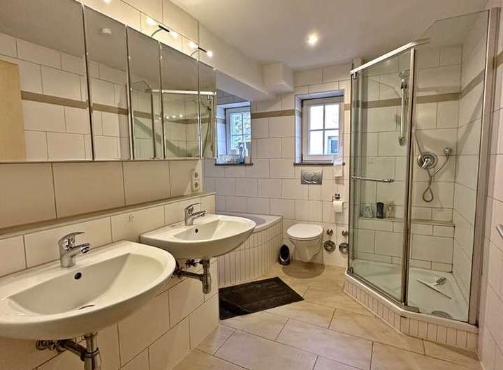 - Tageslichtbad mit Eckbadewanne, Dusche, Doppelwaschbecken, Toilette und Spiegelschrank