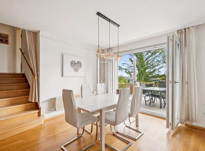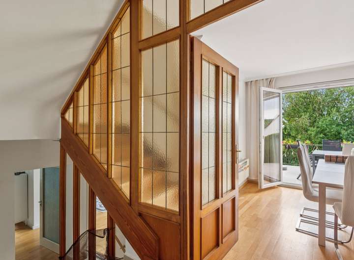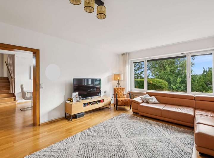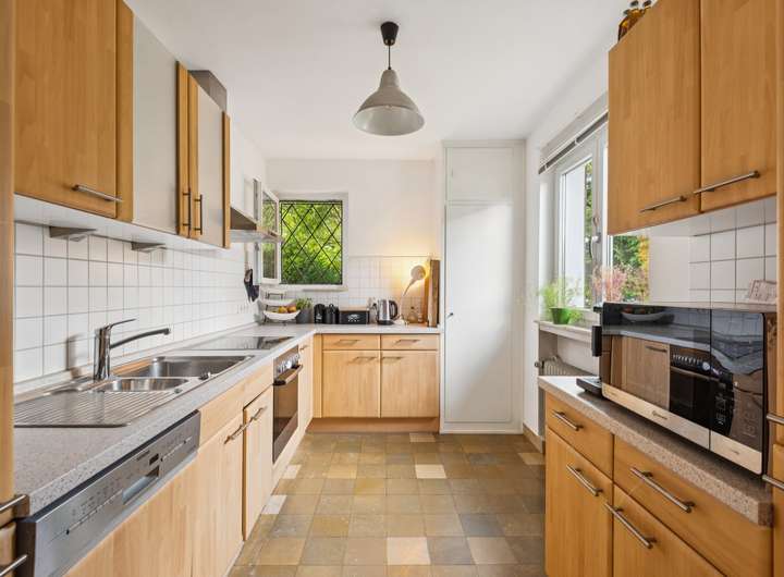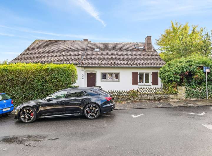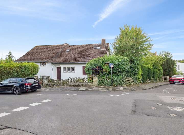 Im Erdgeschoss des 1956 in ansprechender Split-Level-Bauweise errichteten Einfamilienhauses steht Ihnen zunächst ein großzügiges Entreé mit Tageslicht-Gäste-WC zur Verfügung, welches den soliden Anspruch der damaligen Bauausführung erahnen lässt. Durch einen Windfang getrennt, geht es von hier aus zunächst in das Erdgeschoss, welches mit den sehr gut belichteten Wohnräumen aufwartet. Hier finden Sie ein Esszimmer mit Zugang zur Sonnenterrasse, ein großzügiges Wohnzimmer und die Küche vor. Die Wohnräume im gesamten Haus sind mit hochwertigem Parkettboden ausgestattet und die Fenster verfügen teilweise über elektrische Rolläden. Vom Wohn- und Esszimmer aus, haben Sie einen wunderschönen Ausblick in den eingewachsenen Garten mit herrlichem alten Baumbestand.