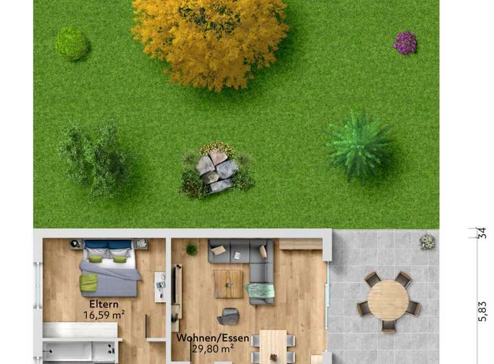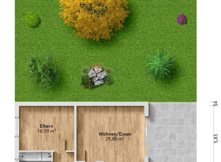 DAS HIGHLIGHT, ist die clevere Bauweise. Durch das weit zur Seite ausgelegte Baufenster entstand ein rechteckiger und ansprechen großer Garten.