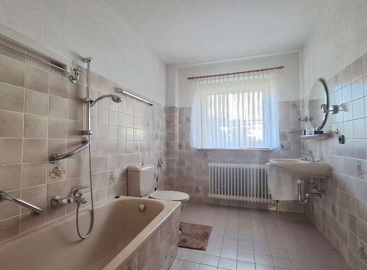 Das gegenüberliegende Wohn/Esszimmer ist der zentrale Treffpunkt im Haus. Große Fenster und der gepflegte Dielenboden schaffen eine warme, einladende Atmosphäre. Ein Wannenbad mit Tageslichtfenster ergänzt das Raumangebot auf dieser Ebene.