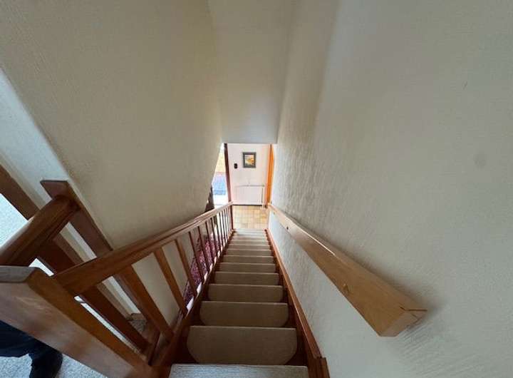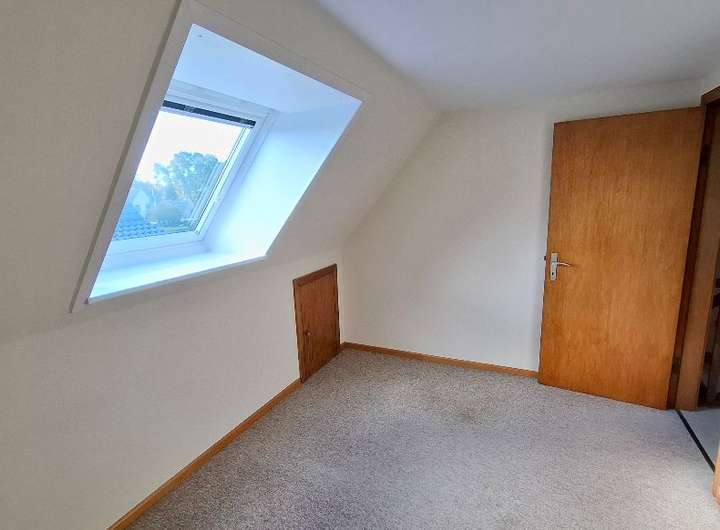 Über eine solide Holztreppe gelangen Sie ins Obergeschoss. Dort befinden sich drei weitere Zimmer, die sich als Schlaf-, Kinder- oder Arbeitszimmer nutzen lassen. Teppichböden und Dachschrägen verleihen den Räumen ein wohnliches Ambiente. Ein separates WC mit Velux-Fenster steht ebenfalls auf dieser Etage zur Verfügung. Zusätzlich bietet der Spitzboden, der über eine Ausziehtreppe erreichbar ist, praktische Lagerfläche.