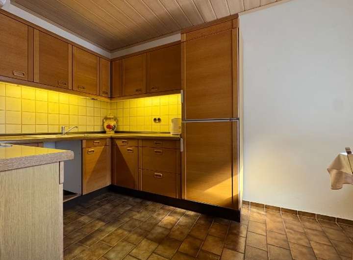Rechts erwartet Sie die geräumige Küche mit klassischen Holzfronten.