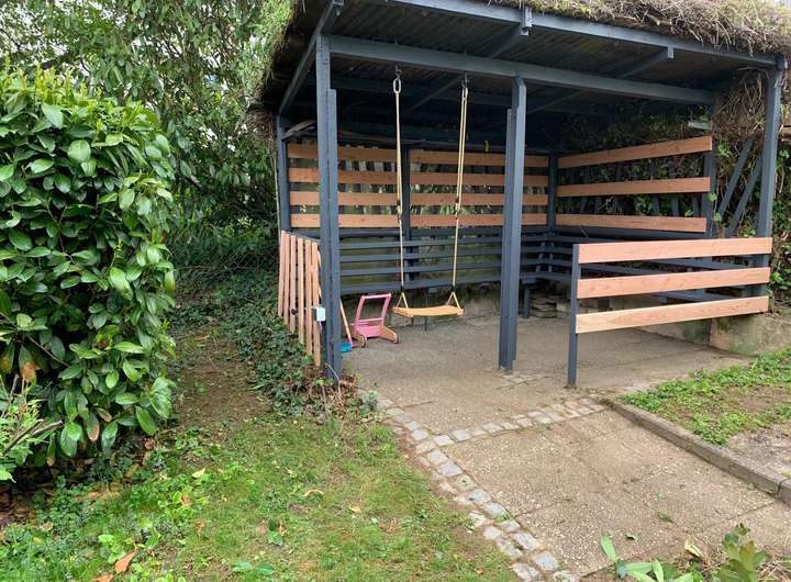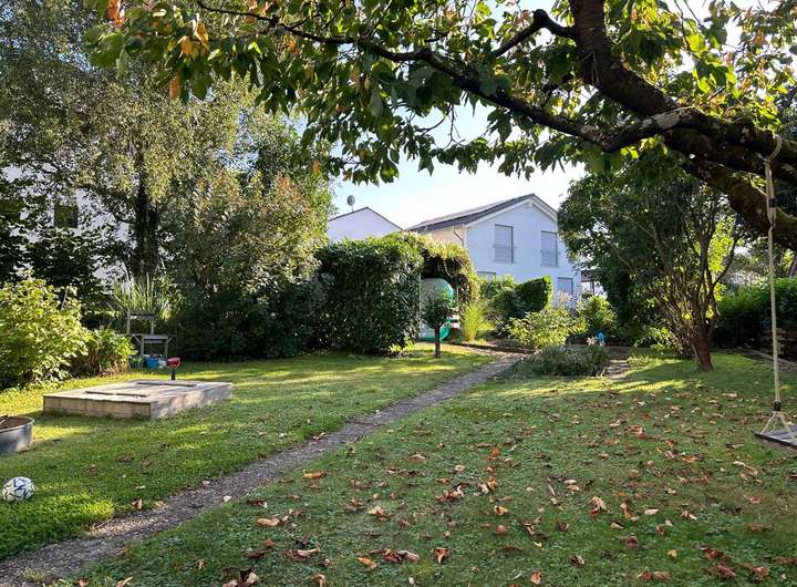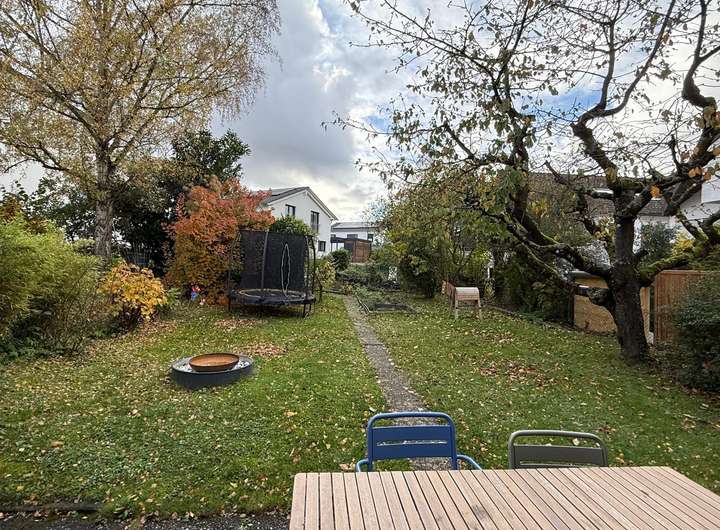 • Garten mit einem Kirschbaum und einer Laube mit Sitzgelegenheit, Wäschetrockenplatz