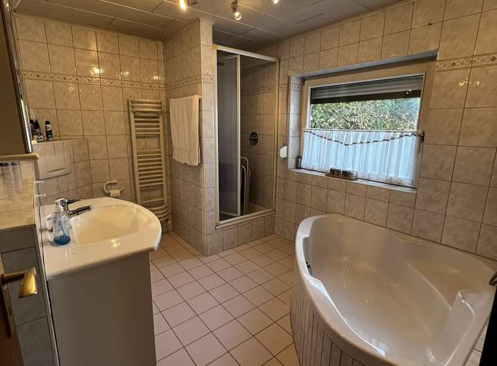 Im Erdgeschoss befinden sich eine großzügige Wohnküche mit direktem Zugang zum Garten, ein Vollbad mit Eckbadewanne und Dusche, ein Hauswirtschaftsraum, ein Schlafzimmer sowie ein Wohnbereich.
