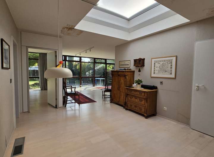 Der Grundriss überzeugt durch klare Strukturen, ein gelungenes Raumkonzept und die großzügigen Fensterflächen. Das Herzstück des Hauses ist das großzügige Wohnzimmer in Verbindung mit einer offenen Essdiele. Durch die großen Fensterfronten und eine Lichtkuppel gelangt besonders viel Licht in diese Bereiche. Der direkte Zugang zur südlich ausgerichteten Terrasse und in den sonnigen Garten, bietet Ihnen hier die Möglichkeit zu entspannen oder gesellige Stunden im Freien mit Familie und Freunden zu verbringen.