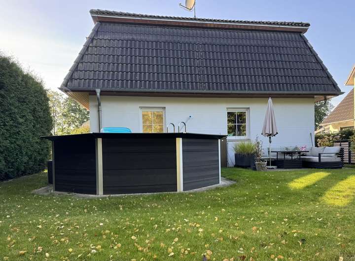 Der rund 16 Kubikliter fassende, fest aufgestellte und optisch ansprechende Pool mit einer Wassertiefe von 130 cm ist in den warmen Monaten das Highlight des Gartens. Mit seiner eigenen Wärmepumpe sind bereits im Frühling schnell 24 Grad Wassertemperatur erreichbar.