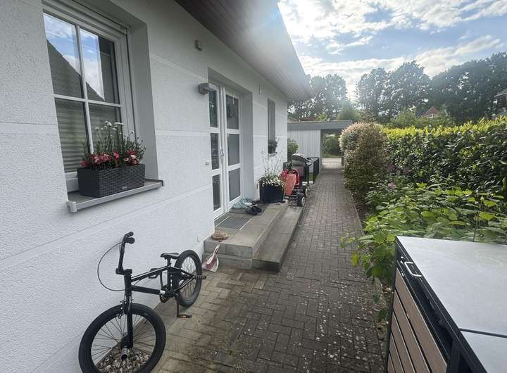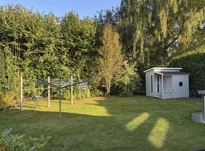 Das sehr gut eingewachsene und nahezu uneinsehbare Grundstück mit seinen pflegeleicht angelegten Gartenflächen vor und hinter dem Haus (Ost- bzw. Westausrichtung) lädt den gesamten Tag über zum Spielen und Toben ein. Auf den beiden großzügigen Terrassen (26 qm bzw. 13 qm) lässt sich die Sonne den gesamten Tag über genießen. Der Carport mit eigener Toranlage verfügt über eine 11-KW Wallbox und einen angrenzenden Abstellraum, der viel Platz für Fahrräder und Gartengeräte bietet.