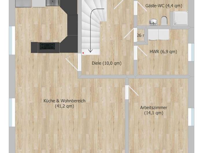 Im Erdgeschoss des Hauses bildet der Wohnbereich mit der offenen Küche und insgesamt über 41 qm Fläche den Mittelpunkt des Hauses. Sie erreichen Ihn durch die rund 12 qm große Eingangsdiele, von welcher auch das Gästebad mit Dusche, sowie ein praktisch eingerichteter Hauswirtschaftsraum erreichbar sind.