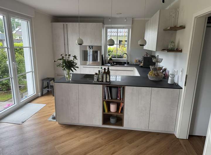 Die 2023 erneuerte, durchdachte Einbauküche der Firma Leicht, im modernen und unaufdringlichen Design, bietet viel Stauraum und ist mit hochwertigen Geräten wie einem extragroßen Backofen von Gaggenau oder einem zweitürigen Bauknecht-Kühlschrank mit zwei großen Gefrierschubladen ausgestattet. Aus dem Quooker-Wasserhahn kann man sowohl gekühltes stilles oder Sprudelwasser direkt genießen oder Heißwasser für Tee bzw. zum Kochen erhalten. Mittelpunkt der Küche ist der zum Essbereich hin ausgerichtete Kochtresen mit seinem Bora Kochfeld mit integriertem Dunstabzug. Hier lässt sich gesellig zusammen kochen und quatschen. Die bodentiefen Fenster öffnen sich zu der rund 26 qm großen Sonnenterrasse mit West-Ausrichtung, auf der man ab Mittags die Sonne genießen und bis in die späten Abendstunden gesellig sitzen kann.