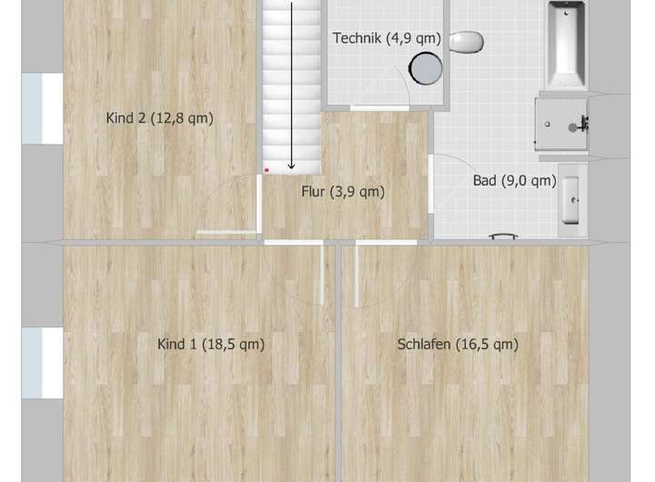 Über die mit Echtholzstufen belegte Treppe gelangt man ins Obergeschoss, welches mit drei Zimmern von je 19, 17 und 13 qm ausreichend Platz für zwei Kinderzimmer und einem Eltern-Schlafzimmer bietet. Das Hauptbadezimmer mit Dusche und Badewanne sowie ein Technikraum, in welchem sich die Gas-Therme und die Lüftungsanlage befinden, sind ebenfalls vom kleinen Flur aus erreichbar.