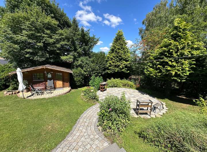 Über den Garten hat man zudem Zugang zur Gartenhütte (mit Fenster, TV, Musik und Stromanschluss) und dem großzügigen Carport des Hauses.