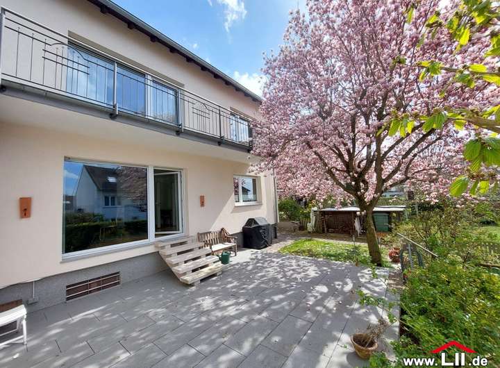 Der nach Süd-Westen ausgerichtete Garten mit großer Terrasse lädt im Sommer zum Verweilen ein. Auf dem Grundstück befindet sich eine Garage und ein davorliegender Stellplatz.