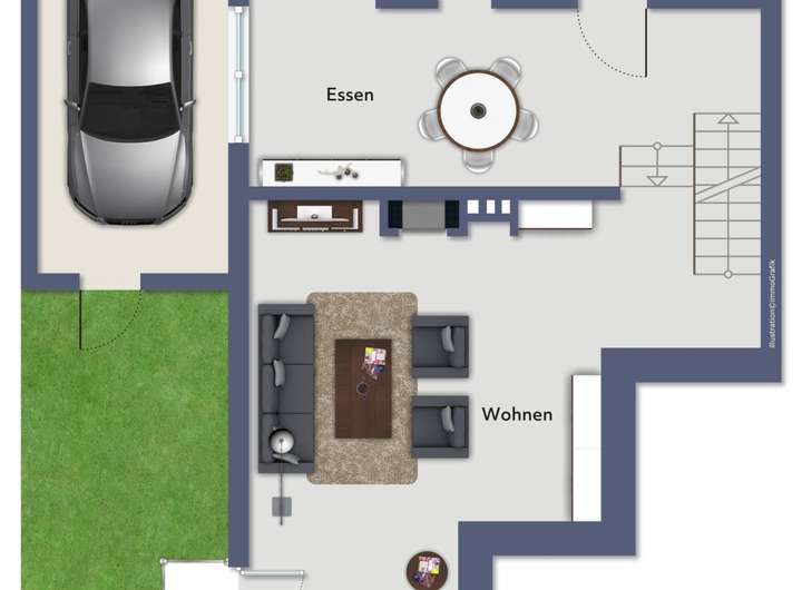 Über den Windfang gelangen Sie direkt in den offenen Wohn- und Essbereich mit angrenzender Küche. Die Raumaufteilung auf versetzten Ebenen sorgt dafür, dass jeder Bereich seine eigene Atmosphäre erhält, ohne die Offenheit des Gesamtkonzepts zu verlieren.