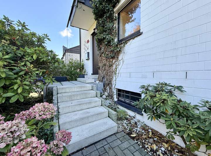 Dieses gepflegte Doppelhaus aus dem Jahr 1984 beeindruckt durch seine einzigartige Split-Level-Architektur. Versetzte Ebenen, durch offene Treppen verbunden, schaffen ein offenes, großzügiges Wohngefühl und lassen das Licht in alle Wohnbereiche fließen. Schon beim Betreten des Hauses über den einladenden Windfang, der mit edlem Naturstein-Granit gestaltet ist, spürt man die besondere Raumwirkung dieses Hauses.