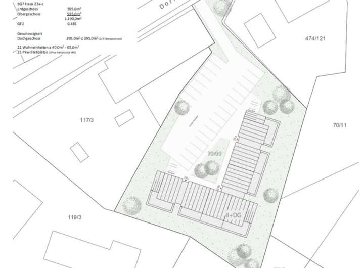 Für das Grundstück 23 liegt bereits ein positiver Bauvorbescheid für die Errichtung eines Mehrfamilienhauses mit rund 21 Wohneinheiten vor. Die Planungen sehen eine überbaute Fläche von etwa 600 Quadratmetern vor, verteilt auf zwei Vollgeschosse sowie ein Dachgeschoss. Die gesamte Bruttogrundfläche umfasst ca. 1.200 Quadratmeter, wodurch eine effiziente und zugleich wohnfreundliche Bebauung ermöglicht wird.