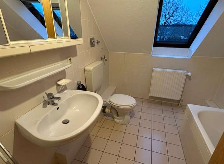 Bad: Modernes Badezimmer mit Fenster und Badewanne, ideal für entspannende Bäder nach einem langen Tag.