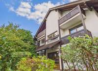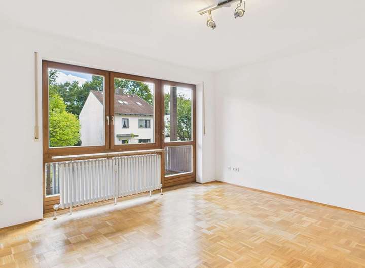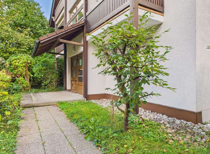 Die Wohnung liegt in einer ruhigen Häusersiedlung in München-Trudering, umgeben von gepflegten Wohnhäusern und viel Grün.
