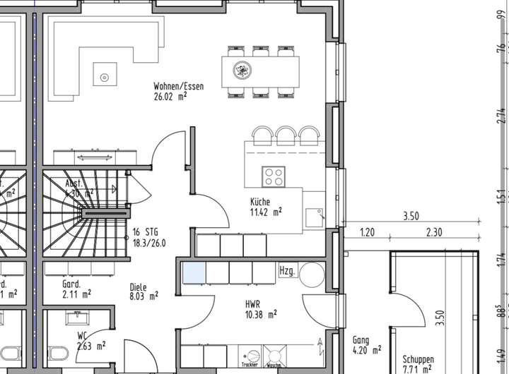 Im Erdgeschoss erwartet Sie ein offener Wohn- und Essbereich mit Küche, der durch große Fensterflächen viel Licht bietet und direkten Zugang zur großen Südwest-Terrasse mit angrenzendem Garten und unverbautem Blick ermöglicht. Zudem stehen ein geräumiger Hauswirtschaftsraum, ein Abstellraum und ein Gäste-WC zur Verfügung.