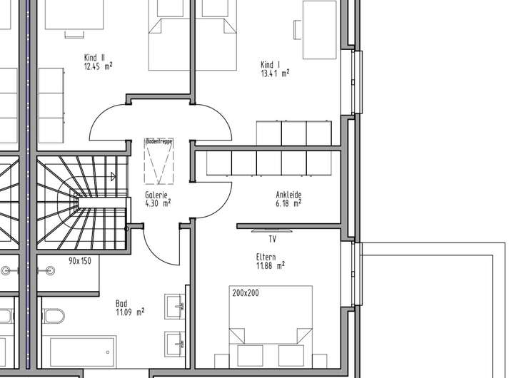 Das Obergeschoss umfasst drei Zimmer, darunter ein Schlafzimmer mit Ankleidebereich, sowie ein großes Badezimmer mit bodengleicher Dusche und Badewanne. Der Dachboden bietet zusätzliche Staufläche.