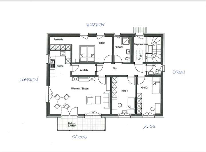 Obergeschosswohnung: weitere 3 Schlafzimmer, 1 Wohnzimmer, Küche, weiteres Bad mit Dusche und WC, 1 GäWC, Balkon - private Rückzugsmöglichkeit oder Besprechungen im Freien