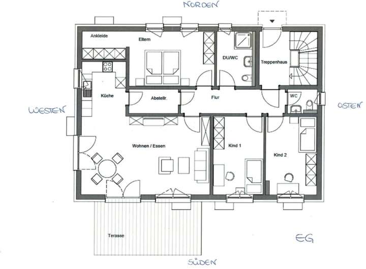 Erdgeschoss, ca. 120 qm: 3 Schlafzimmer, 1 Wohnzimmer, Küche, Bad mit WC und Dusche, GäWC, Terrasse und eigener Garten - ideal für Pausen, Meetings im Freien.
