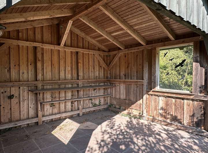 Gegenüber dem Wohnhaus steht der ehemalige Stall, heute mit zwei großzügigen Räumen ideal zur Aufbewahrung von Fahrrädern, Gartengeräten oder für kreative Projekte. Dahinter befindet sich ein praktischer Holzlagerplatz. Die Garage bietet Platz für ein Fahrzeug und führt direkt auf eine überdachte Terrasse – perfekt für spontane Grillabende oder den Morgenkaffee an der frischen Luft.