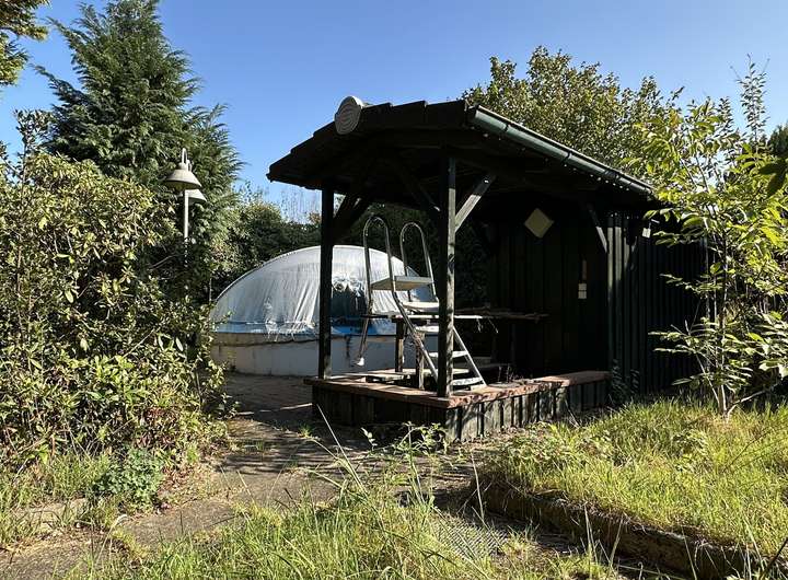 Ein weiteres Highlight ist das separate Nebengebäude, das ursprünglich als Werkstatt und später als barrierearmer Wohnbereich genutzt wurde. Es verfügt über einen großen Aufenthaltsraum mit Kamin, WC und Dusche, Anschlussmöglichkeit für eine Waschmaschine sowie Platz für eine Pantryküche. Ein angrenzender Raum wurde früher als Sauna genutzt und kann bei Wunsch wieder aktiviert werden. Seitlich schließt sich eine Werkstatt mit Starkstromanschluss an – ideal für Handwerker, Bastler oder Hobbyprojekte. Im hinteren Teil des Grundstücks erwartet Sie ein liebevoll angelegter Nutzgartenbereich mit Gemüsebeeten, Gewächshaus und sonnigen Flächen für den Anbau. Ein kleiner Pool mit Technikhaus sorgt für Erfrischung an warmen Tagen und kann mit wenig Aufwand wieder in Betrieb genommen werden. Ein weiteres Gartenhaus im hintersten Teil des Grundstücks eignet sich perfekt als Partyraum, Fitnessbereich oder Atelier – hier dürfen Sie Ihrer Fantasie freien Lauf lassen.