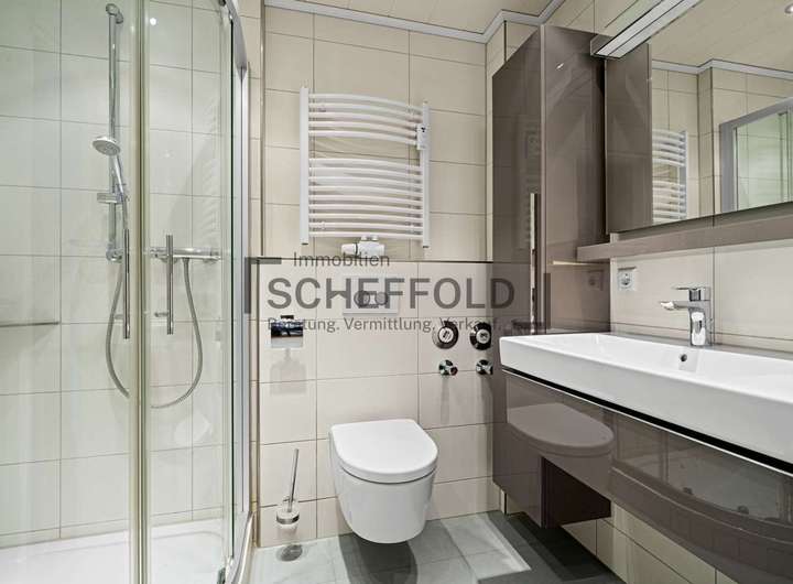 Abgerundet wird die Wohnung durch das modern sanierte Badezimmer, ausgestattet mit Dusche, WC, stilvollem Waschtisch und einem Waschmaschinenanschluss – funktional, ansprechend und zeitgemäß gestaltet.