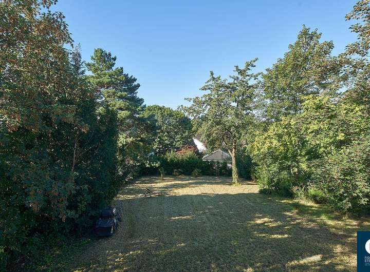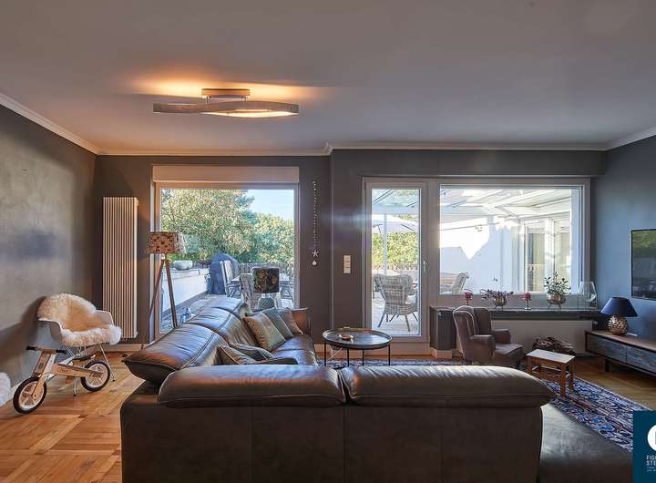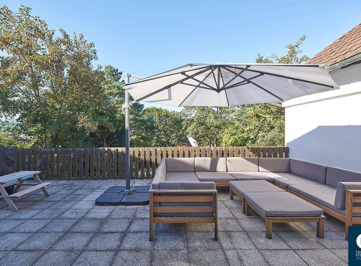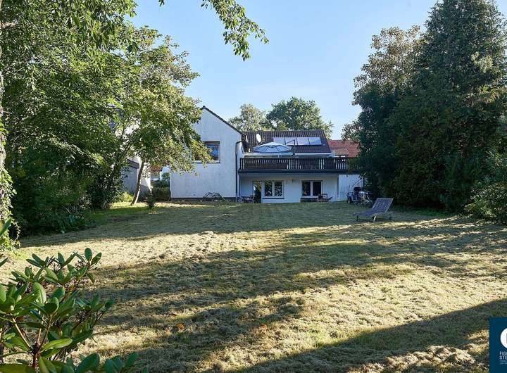 Vom Wohnbereich aus haben Sie einen Zugang zur 60 m² großen Terrasse in Südwestausrichtung, von der aus Sie über eine Treppe in den großzügig geschnittenen Garten gelangen. Da die Terrasse teilüberdacht ist, können Sie bei jedem Wetter draußen sitzen und den traumhaften Blick in den Garten mit seinem alten Baumbestand genießen.