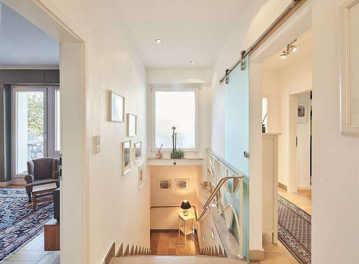 Durch die Hanglage befindet sich die untere Wohnetage auf Gartenebene in die Sie über eine schicke Marmortreppe gelangen.