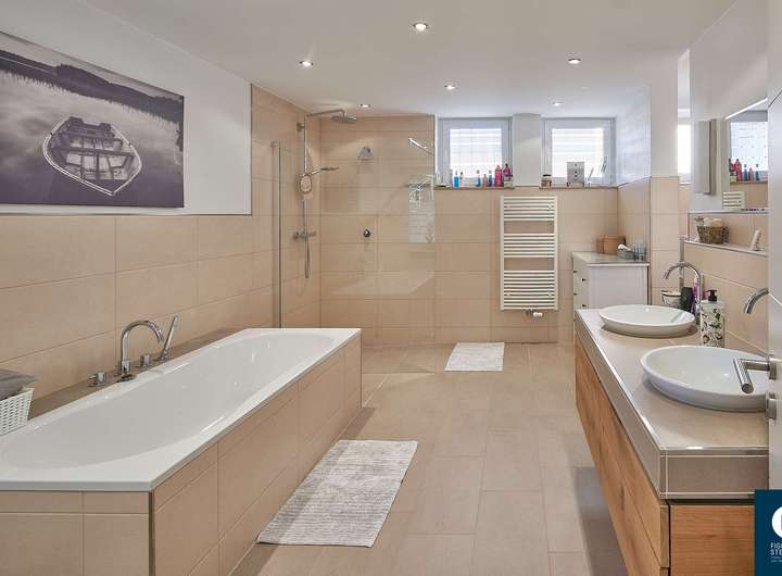 Ein weiteres Highlight: Vom Elternschlafzimmer aus gelangen Sie nicht nur direkt in den Garten sondern über das angrenzende Badezimmer auch in die 3-Personen-Sauna. Das Bad en Suite ist mit Badewanne, Dusche, großem Waschtisch und drei Fenstern ausgestattet. Hier wurde im Zuge der Modernisierungen eine Fußbodenheizung verlegt.